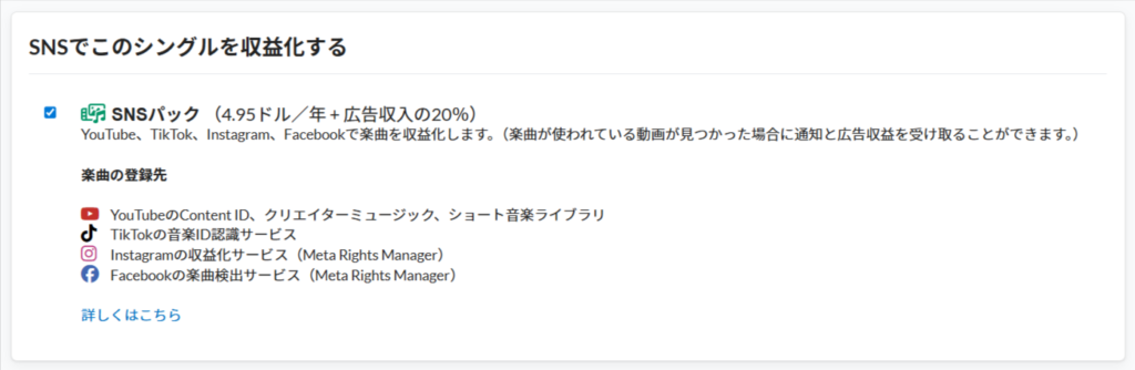 アップロード画面の下部にある「SNSでこのシングルを収益化する」という項目を探してください。